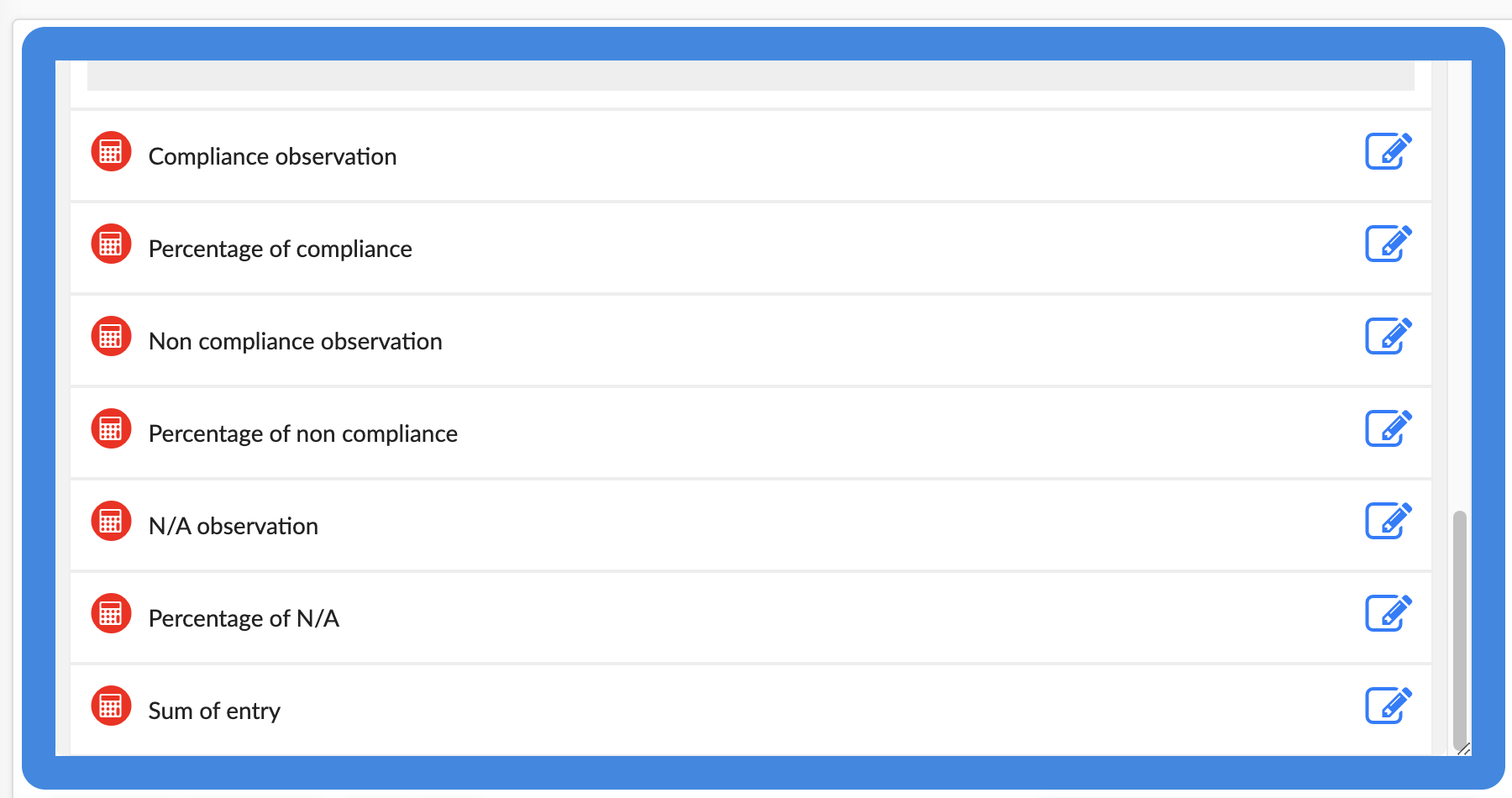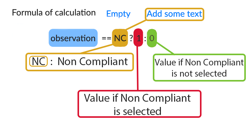 Then, we use the same formula, we will only change the code. For example, here is the formula of our second element "Non compliance observation": Tips: Don't hesitate to hide your calculation fields so they won't appear on your employee's mobile device. To do this, go to the element options, Visibility tab, and check the field always hidden checkbox.