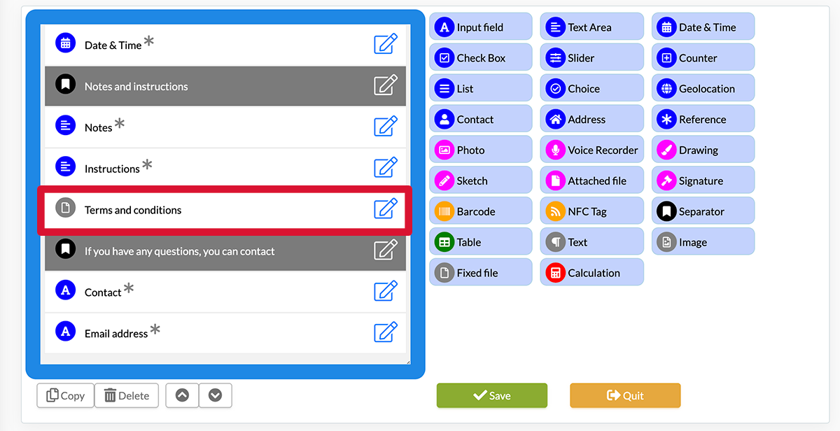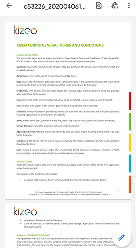 The fixed file element allows you to add a permanent PDF to your form when creating it on the back-office; available for consultation when entering data on a mobile device. Example. You are a salesman and want to integrate the general conditions of sale as an attachment to your form. This will help you to advise your clients on the general conditions.